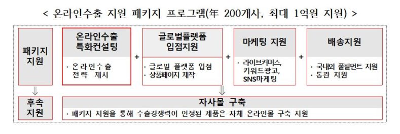 온라인수출패키지 사업은 글로벌 쇼핑몰 입점, 마케팅, 물류, 컨설팅 등 온라인수출 전 과정을 패키지로 지원하는 사업으로, 기업당 최대 1억원이 지원된다.