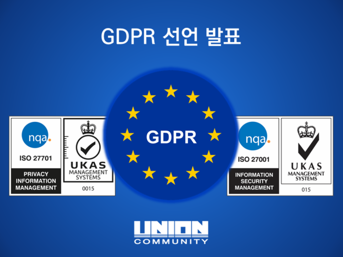 유니온커뮤니티는 지난해 11월 정보보호 경영시스템 표준인 ‘ISO/IEC 27001’과 개인정보보호 경영시스템 표준인 ‘ISO/IEC 27701’ 인증을 획득했다. 이에 이어서 27일 공식으로 GDPR 법률에 따른 개인정보 보호를 실시함을 발표했다.