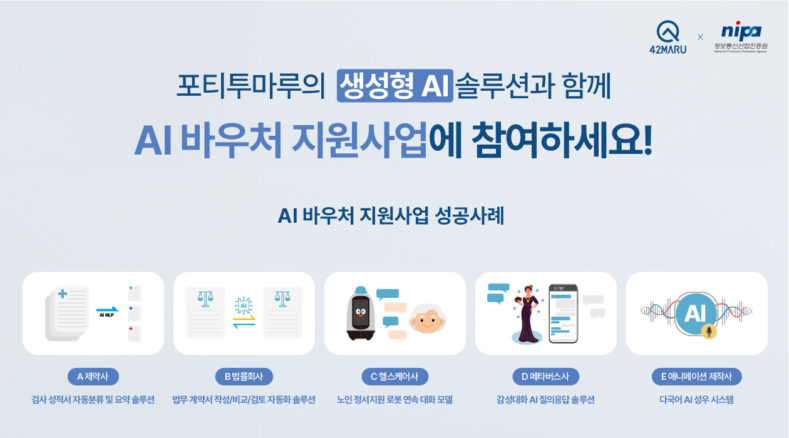 생성형 AI 스타트업 포티투마루(42Maru, 대표 김동환)가 과학기술정보통신부와 정보통신산업진흥원(NIPA)이 주관하는 ‘2024 AI 바우처 지원 사업’에 4년 연속 공급기업으로 선정되어 수요기업을 모집하고 있다고 29일 밝혔다.