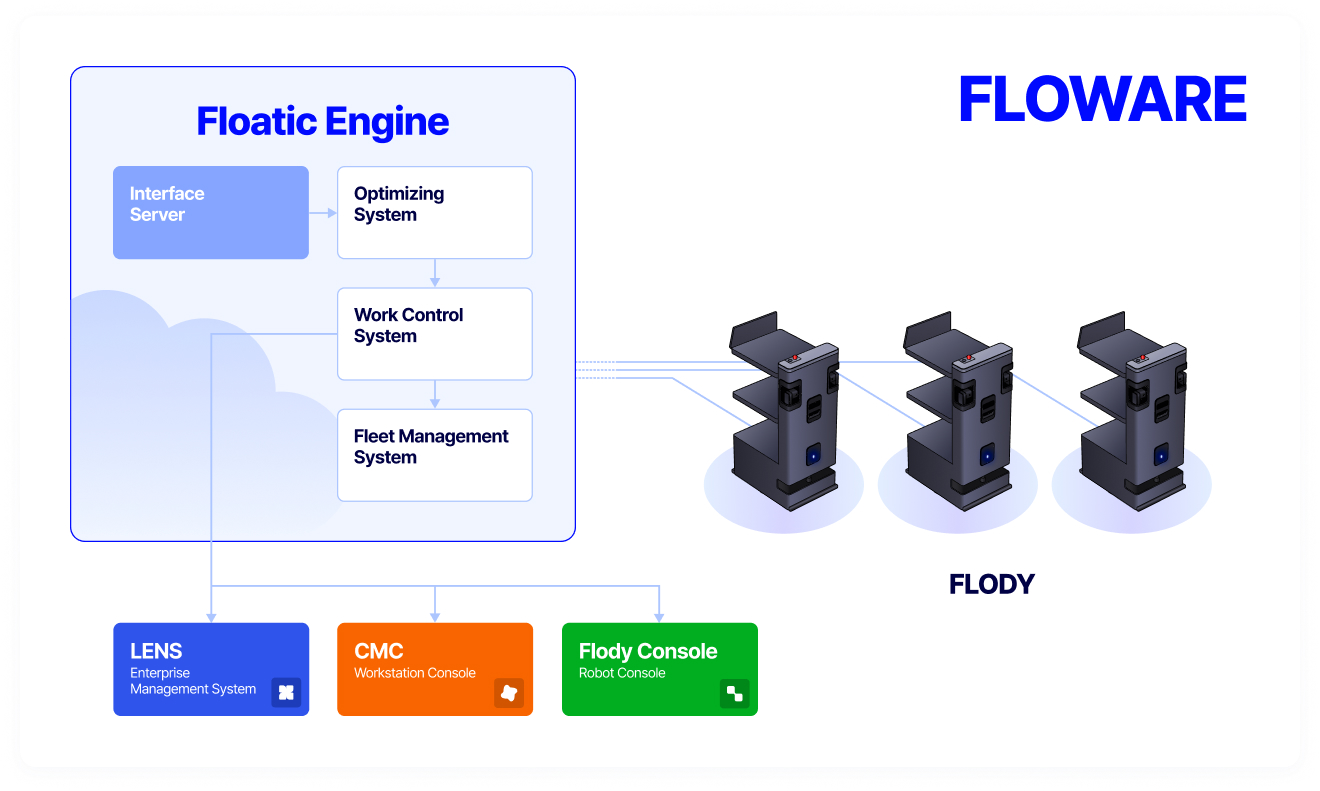 플로웨어는 이커머스 물류센터의 출고에서 가장 많은 시간을 차지하는 피킹 프로세스를 효율적으로 돕는 로봇 솔루션이다. 고객사 시스템과 연동해 가장 생산적인 방법으로 주문 작업을 계획하고 관리하는 플랫폼 ‘플로틱 엔진’과 사람과 함께 피킹 작업을 실제 이행하는 자율주행 로봇 ‘플로디’로 구성되어 있다.
