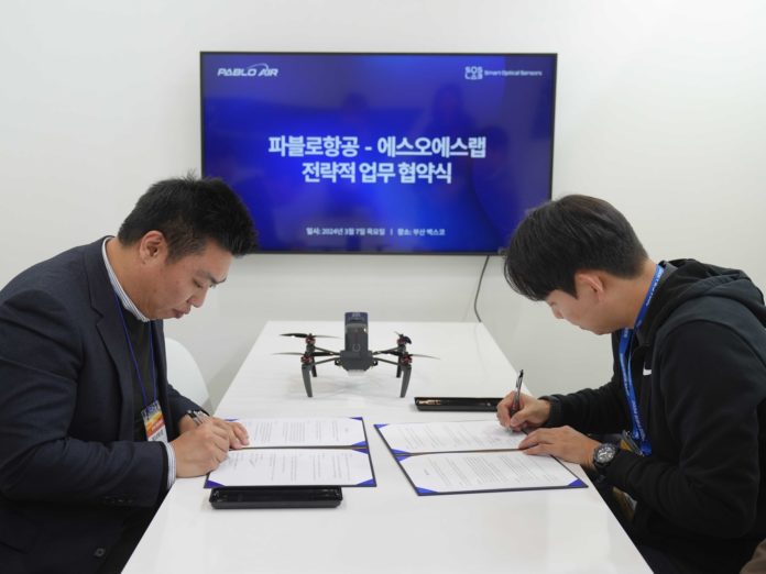 무인이동체 자율군집제어 전문기업 파블로항공(대표이사 김영준)이 고정형 라이다 솔루션 선두주자인 에스오에스랩과 3월 7일 2024 드론쇼코리아 파블로항공 부스 현장에서 전략적 기술 제휴를 위한 양해각서(MOU)를 체결했다고 8일 밝혔다.