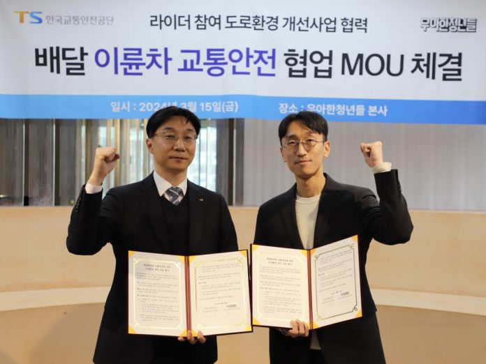 배달의민족의 물류서비스를 전담하는 우아한청년들(대표이사 김병우)과 한국교통안전공단은 15일 우청 본사에서 안전한 배달환경을 확산하고 도로환경을 개선하는 ‘라이더 도로안전 시민점검단’을 모집하는 업무협약을 체결했다고 16일 밝혔다. 이날 자리에는 우아한청년들 박승선 라이더정책실장, 한국교통안전공단 전연후 교통안전처장 등 관계자들이 참석했다.