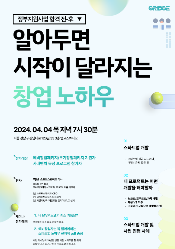 IT 개발 플랫폼 그릿지는 오늘 4월 4일 서울 강남에 위치한 앨고스튜디오에서 ‘스타트업 창업 성공하는 노하우’를 주제로 세미나를 개최한다고 밝혔다.