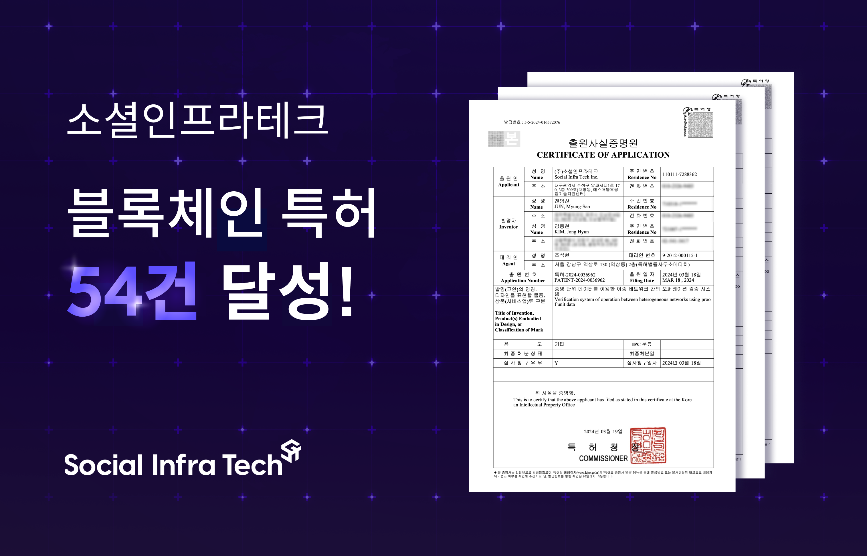 블록체인 스타트업 소셜인프라테크가 독자기술로 개발한 블록체인 메인넷 ‘Mitum’과 관련하여 3개의 신규 특허를 추가 출원하며 누적 특허 54건을 달성했다고 20일 밝혔다.