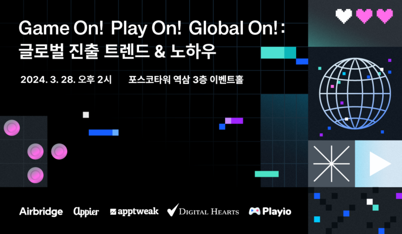 글로벌 AI 서비스형 소프트웨어(SaaS) 기업 애피어(Appier)가 글로벌 진출을 원하는 게임 마케터들을 위한 오프라인 세미나를 오는 28일 역삼 포스코 타워에서 개최한다고 밝혔다. 에어브릿지, 앱트위크, 디지털하츠, 플레이오와 함께 진행하는 이번 행사는 ‘Game On! Play On! Global On! : 글로벌 진출 트렌드&노하우’를 주제로 열린다.
