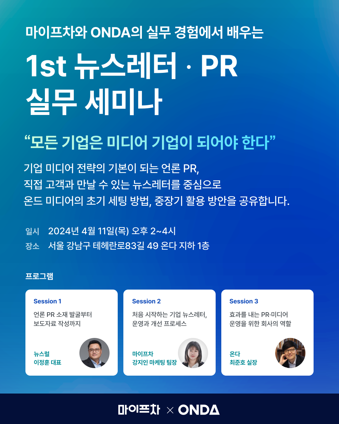 ONDA(대표 오현석)는 마이프차(대표 김준용)와 공동으로 오는 11일 오후 2시 삼성동 온다 사옥에서 ‘1st 뉴스레터·PR 실무 세미나’를 개최한다고 발표했다. 세미나는 스타트업 및 여행·프랜차이즈 업계 종사자를 대상으로 무료로 진행된다.
