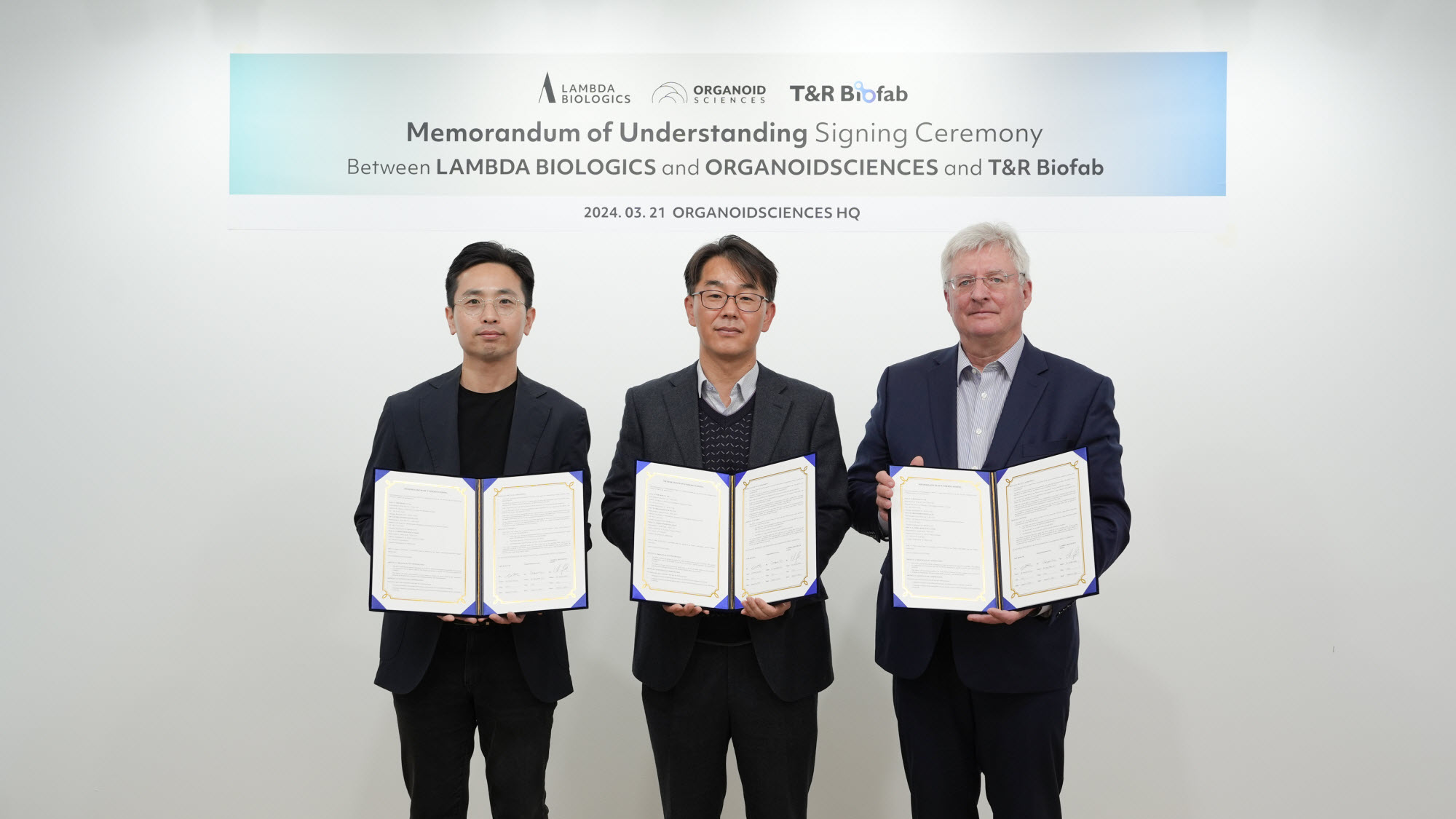 3D 바이오프린팅 기반 재생의료 전문기업 티앤알바이오팹이 오가노이드 기반 치료제 전문기업 오가노이드사이언스, 독일의 동물실험 대체 바이오 기술 플랫폼 기업 람다 바이오로직스(Lambda Biologics, 이하 람다)와 ‘오가노이드 글로벌 상용화’를 위한 상호 협력 MOU를 체결했다.