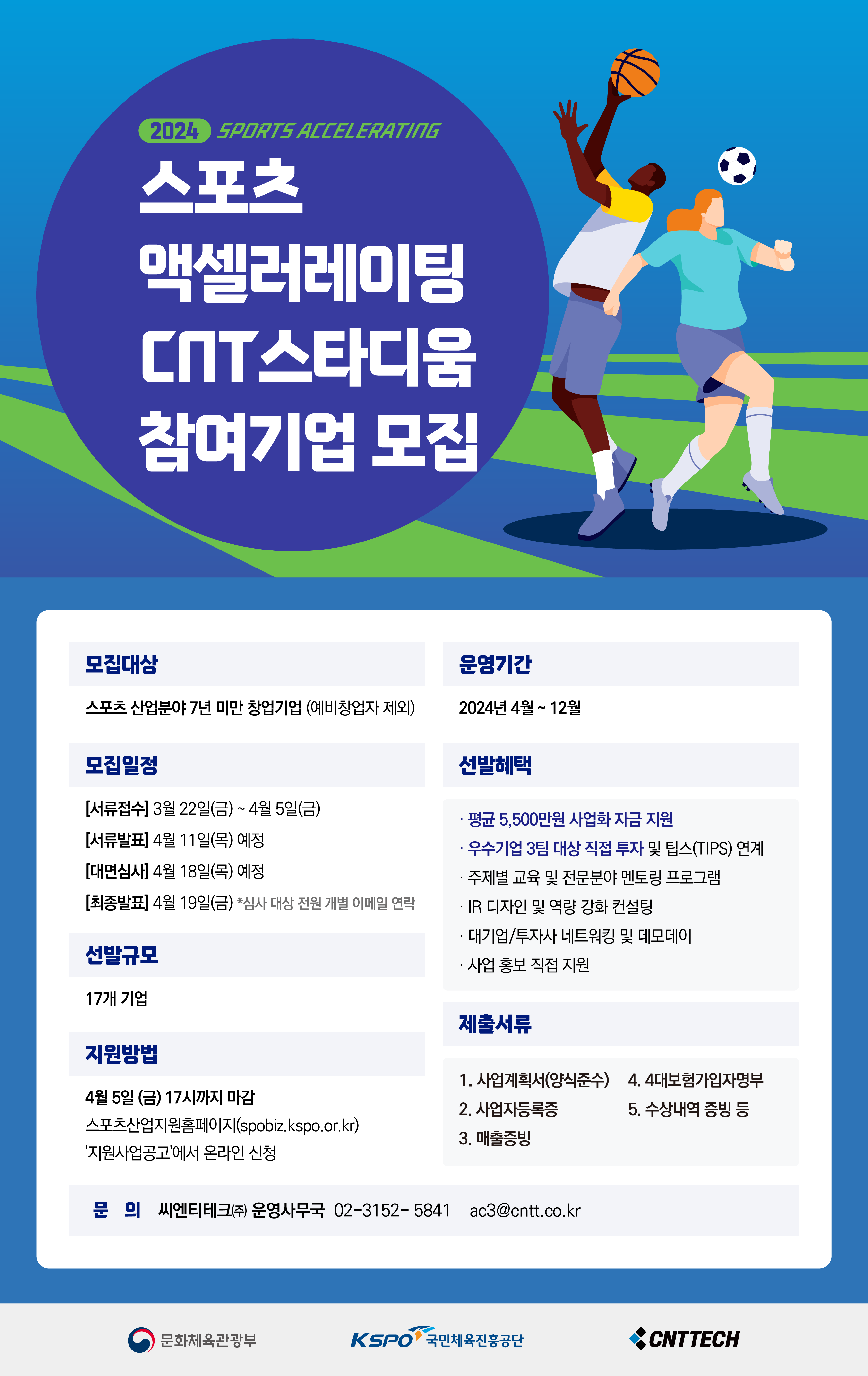 모집대상은 공고 마감일 기준으로 업력 7년 미만 투자유치를 희망하는 스포츠 분야 창업기업이다. 4월 5일(금) 17시까지 스포츠산업지원 홈페이지(spobiz.kspo.or.kr)를 통해 신청할 수 있고 관련한 양식과 자세한 공고문은 창업지원포털(K-Startup)과 이벤터스 및 온오프믹스에서도 확인이 가능하다.