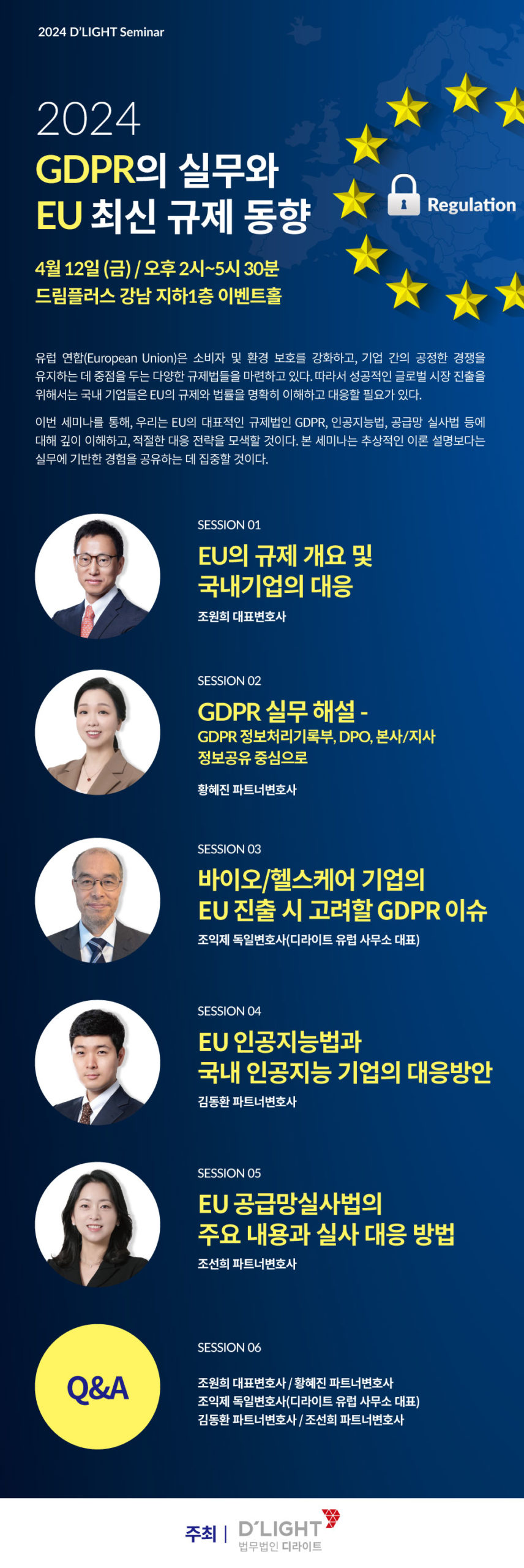 세미나는 디라이트 유럽사무소 대표를 맡고 있는 조익제 외국변호사(독일)를 비롯해 EU 규제 관련 업무에 정통한 변호사들이 참가한다. 발표는 ▲EU의 규제 개요 및 국내기업의 대응(조원희 대표변호사) ▲GDPR 실무 해설 – GDPR 정보처리기록부, DPO, 본사/지사 정보공유 중심으로(황혜진 파트너변호사) ▲바이오/헬스케어 기업의 EU 진출 시 고려할 GDPR 이슈(조익제 독일변호사(디라이트 유럽사무소 대표)) ▲EU 인공지능법과 국내 인공지능 기업의 대응방안(김동환 파트너변호사) ▲EU 공급망실사법의 주요 내용과 실사 대응 방법(조선희 파트너변호사) 등으로 구성됐다.