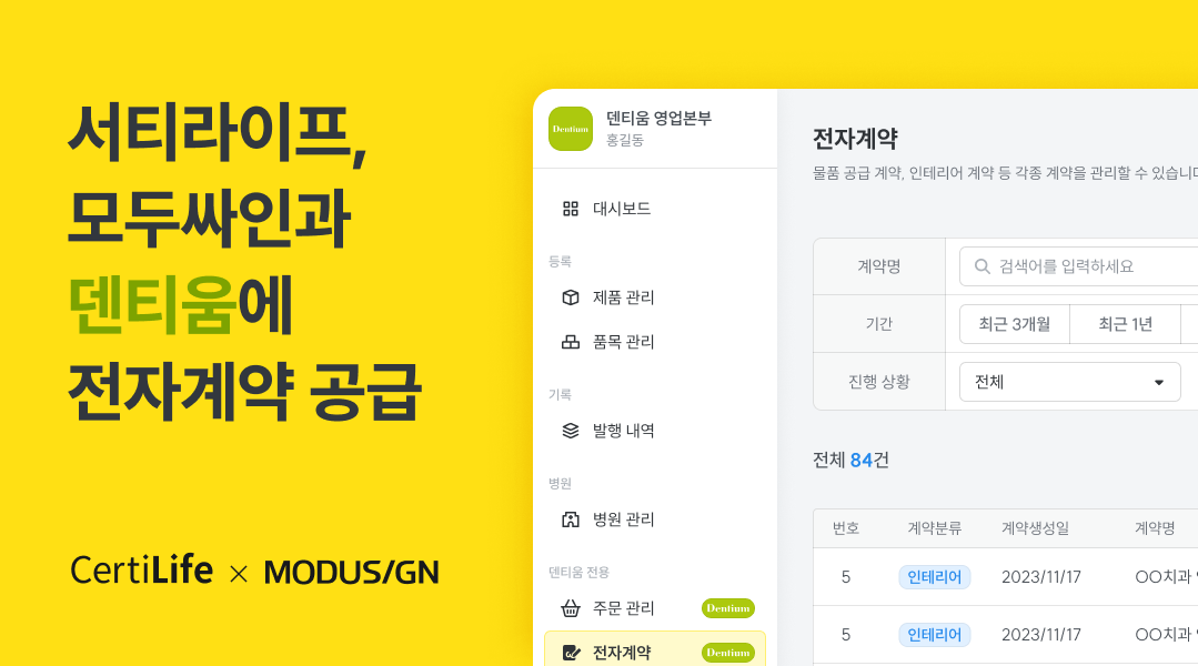 서티라이프가 주도한 덴티움 맞춤형 전자계약 시스템은 의료기기 공급계약 등 각종 계약을 전자화한다. 의료산업 현장을 감안하여 카카오톡을 이용한 비대면 계약, 온디바이스 대면 전자계약 방식을 전부 구현했다. 각 병의원과의 계약 체결 현황을 실시간으로 관리할 수 있어 계약 체결이 지연되거나 누락으로 인해 발생하는 비효율을 감소시킨다.