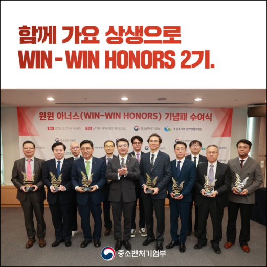 중소벤처기업부(장관 오영주)는 지난 27일 ‘2기 윈윈 아너스 기념패 수여식’을 개최하고 ‘윈윈 아너스’ 사례로 선정된 대기업․공공기관과 대표 협력 중소기업에 기념패를 수여했다.