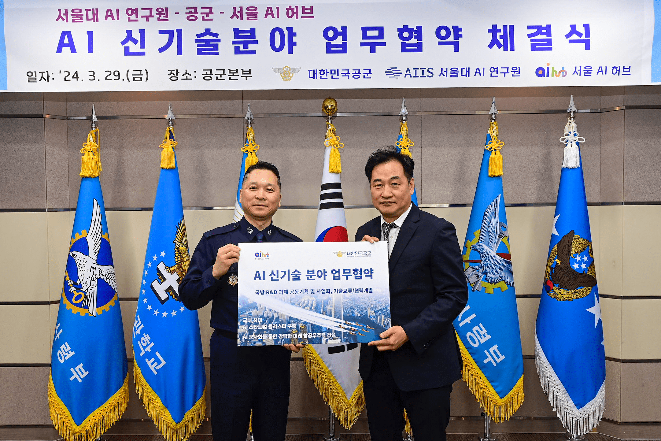 서울대학교 AI연구원은 AI·신기술 분야 학술 및 인적교류, 공동연구를 통한 공군의 AI 역량을 강화하는 것에 협력한다. 공군 지휘관들을 대상으로 AI 정책과정을 개설하고 이를 정례화하는 등 연구원 자체 교육 프로그램에 공군 장병들이 참여할 수 있도록 돕는다. 공군은 국방분야 기술개발 사업과 정부부처 R&D 과제에 있어서도 공동으로 기획하고 사업 참여를 지원할 예정이다.