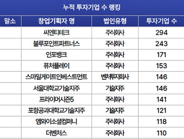 투자 건수 부문으로 2022-2023년을 살펴보면 2년 연속 상위 10위 안에 드는 액셀러레이터로 씨엔티테크, 블루포인트파트너스, 인포뱅크, 퓨처플레이, 한국투자액셀러레이터 5개사가 있으며, 그 중 씨엔티테크는 2022년, 2023년 2년 연속 투자 건수 부문에서 1위를 차지했다. 씨엔티테크는 2021년부터 투자 건수 부문 4년 연속 1위를 차지하고 있는 AC로 최근 가장 활발한 행보를 보이고 있는 투자사로 나타났다.