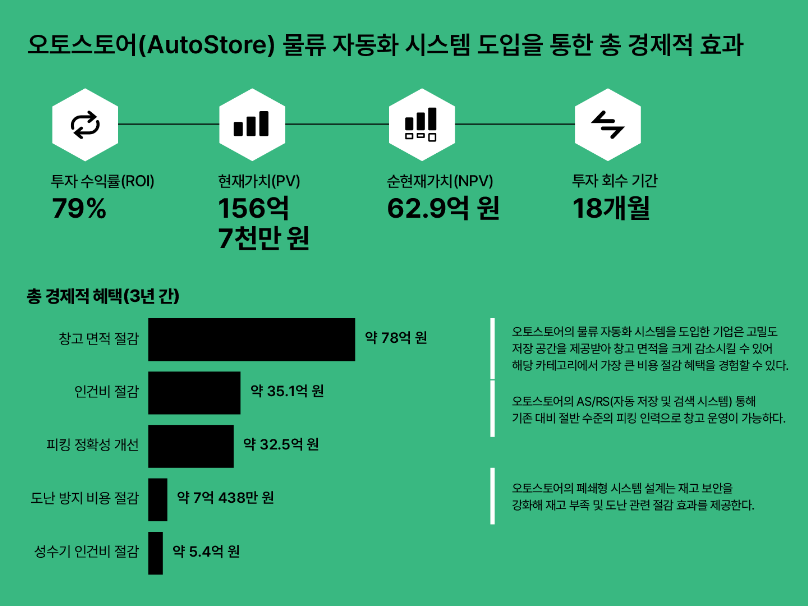 보고서에 따르면, 이들 다섯 기업은 오토스토어 도입 후 3년 간 총 87.4억 원(673만 달러)의 시스템 도입 비용 대비 총 약 156억7천만 원(1,205만 달러)의 경제적 효과를 거둬, 총 약 69.2억 원(532만 달러)이라는 높은 순현재가치(NPV)를 기록했다. 또한, 18개월의 투자 회수 기간과 79%에 달하는 높은 ROI를 달성했다.
