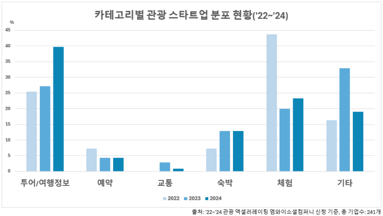 체험 기반 스타트업은 2024년 지원 스타트업 중 약 24%로, 두번째로 큰 비중을 차지하였으며, 2023년 보다 비중이 다소 증가하였다. 웰니스/예술 등을 활용해 새로운 관광 경험을 제공하는 솔루션들이 주를 이루었다. 예약과 숙박을 핵심 아이템으로 하는 스타트업은 2023년과 2024년에 비슷한 비중을 유지하고 있으며, 교통 관련 아이템의 스타트업은 매년 가장 낮은 비중을 차지하고 있다.