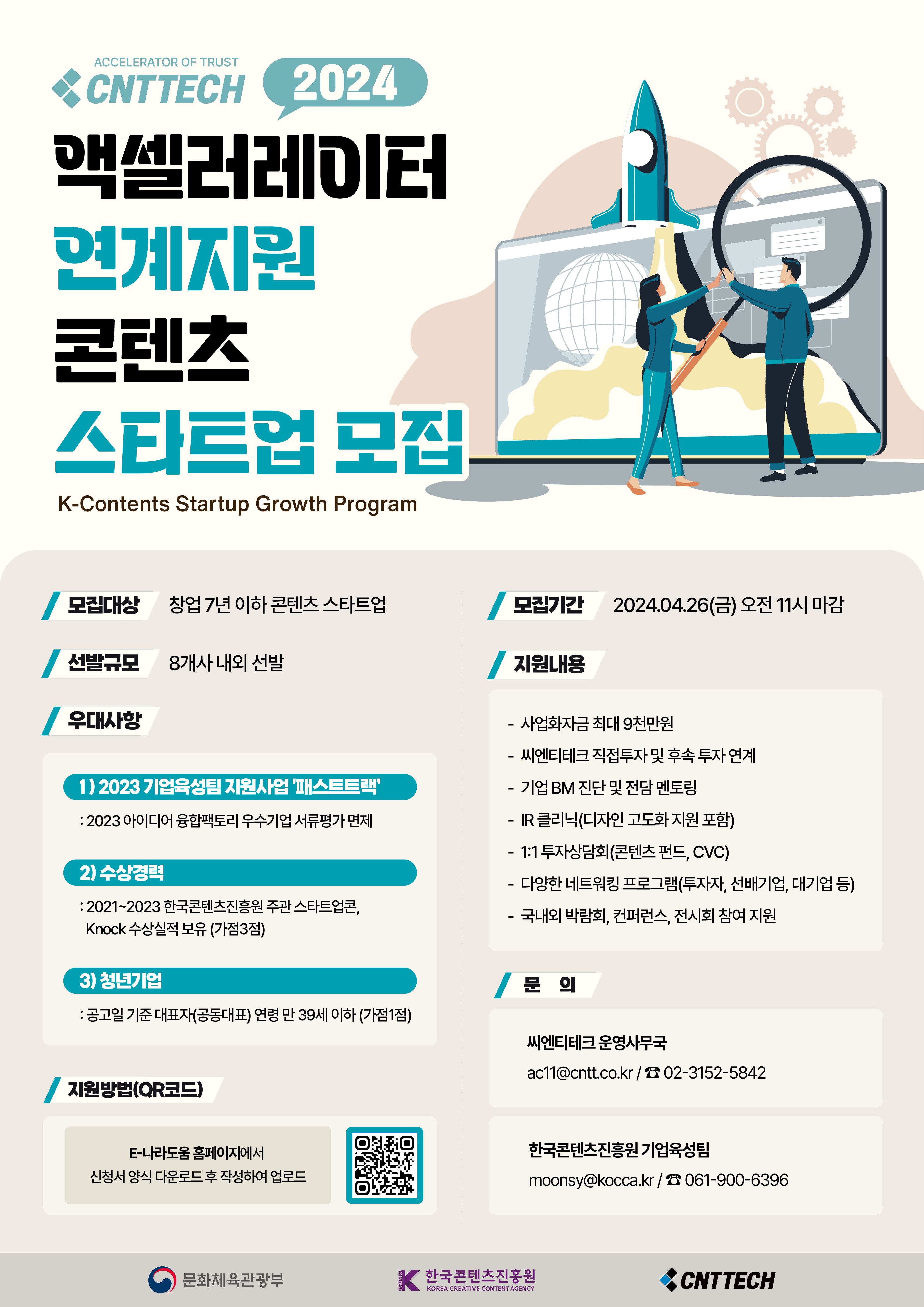 투자 전문 액셀러레이터 씨엔티테크(주)(CNTTECH)가 한국콘텐츠진흥원에서 지원하는 ‘2024년 콘텐츠 액셀러레이터 연계지원 프로그램’인 ‘K-Contents Startup Growth Program’에 참여할 콘텐츠 스타트업을 모집한다고 밝혔다.