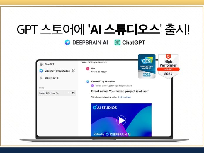 국내 생성형 인공지능(AI) 전문 기업 딥브레인AI(대표 장세영)는 영상합성 플랫폼 ‘AI 스튜디오스(Video GPT by AI Studios)’를 GPT 스토어에 출시했다고 17일 밝혔다.