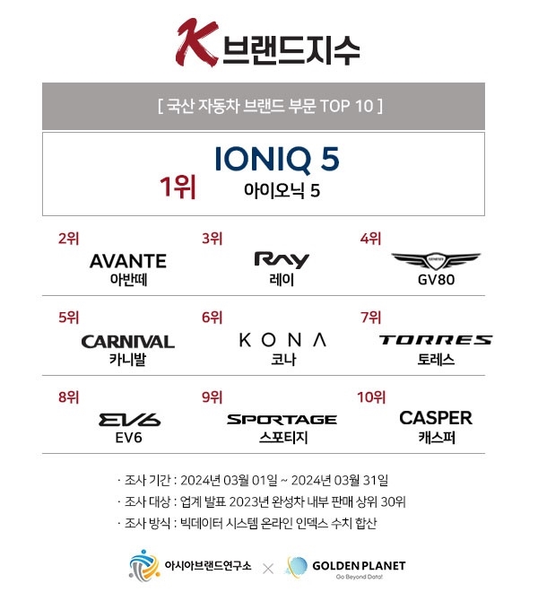 아시아브랜드연구소와 골든플래닛이 자체 개발한 빅데이터 시스템을 통해 산출된 국산 자동차 부문은 2024년 3월 1일부터 31일까지의 온라인 빅데이터를 기반으로 분석했다.