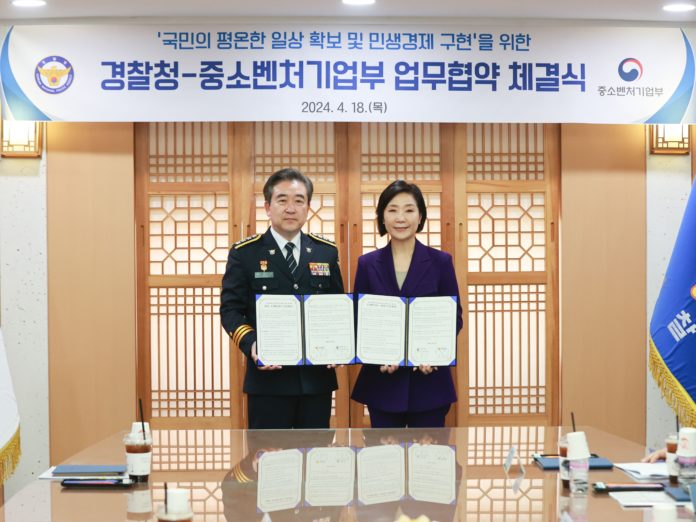 중소벤처기업부(장관 오영주, 이하 중기부)경찰청(청장 윤희근)은 18일 경찰청 제2회의실에서 국민의 평온한 일상 확보와 중소·벤처·소상공인이 행복한 민생경제 구현을 위해, 치안 분야 중소기업 기술개발·해외시장 개척, 중소기업 기술 보호와 소상공인 안전망 강화 등을 위한 업무협약을 체결하였다.