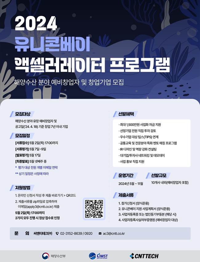 스타트업 투자 전문 액셀러레이터 씨엔티테크(주)(대표 전화성, CNTTech)가 해양수산 분야의 예비창업자와 유망한 스타트업을 발굴, 육성하고자 ‘2024 유니콘베이 액셀러레이터 프로그램’ 참여기업을 오는 5월 2일 17시까지 모집한다.