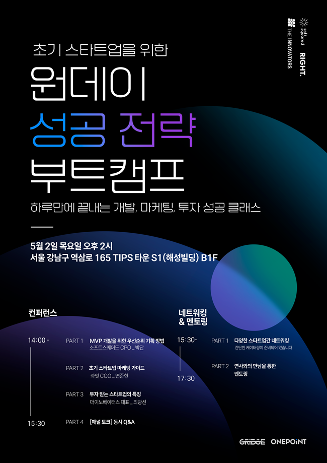 IT 개발 플랫폼 그릿지는 오는 5월 2일 서울 강남에 위치한 팁스타운 S1(해성빌딩) B1F에서 ‘초기 스타트업을 위한 원데이 성공전략 부트캠프’ 를 오프라인으로 개최한다고 22일 밝혔다.
