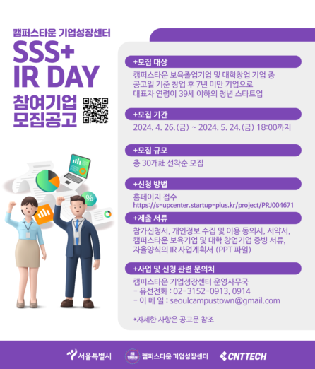 서울특별시와 투자 전문 액셀러레이터 씨엔티테크(주)(대표 전화성)가 운영하는 캠퍼스타운 기업성장센터에서 트리플에스(SSS+) 데모데이에 참여할 우수 스타트업을 선발하기 위한 트리플에스 IR DAY 프로그램에 참여할 기업을 오는 24일까지 모집한다.