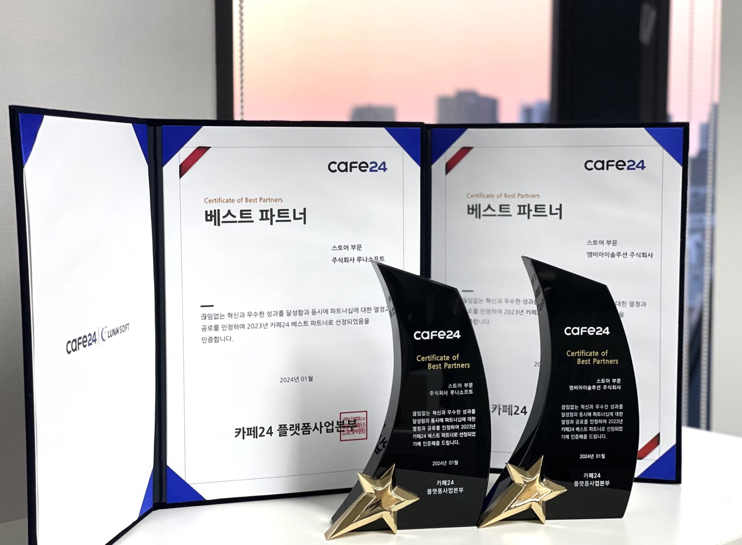 카페24는 매년 지난 한 해 동안 카페24 플랫폼 기반 이커머스 생태계와 온라인 사업자의 성장을 위해 힘쓴 우수 파트너사를 엄선해 시상한다. 루나소프트와 엠비아이솔루션은 카페24 스토어 부문 베스트 파트너사로 선정되며 이커머스 사업자 지원에 대한 높은 기여도를 인정받았다.