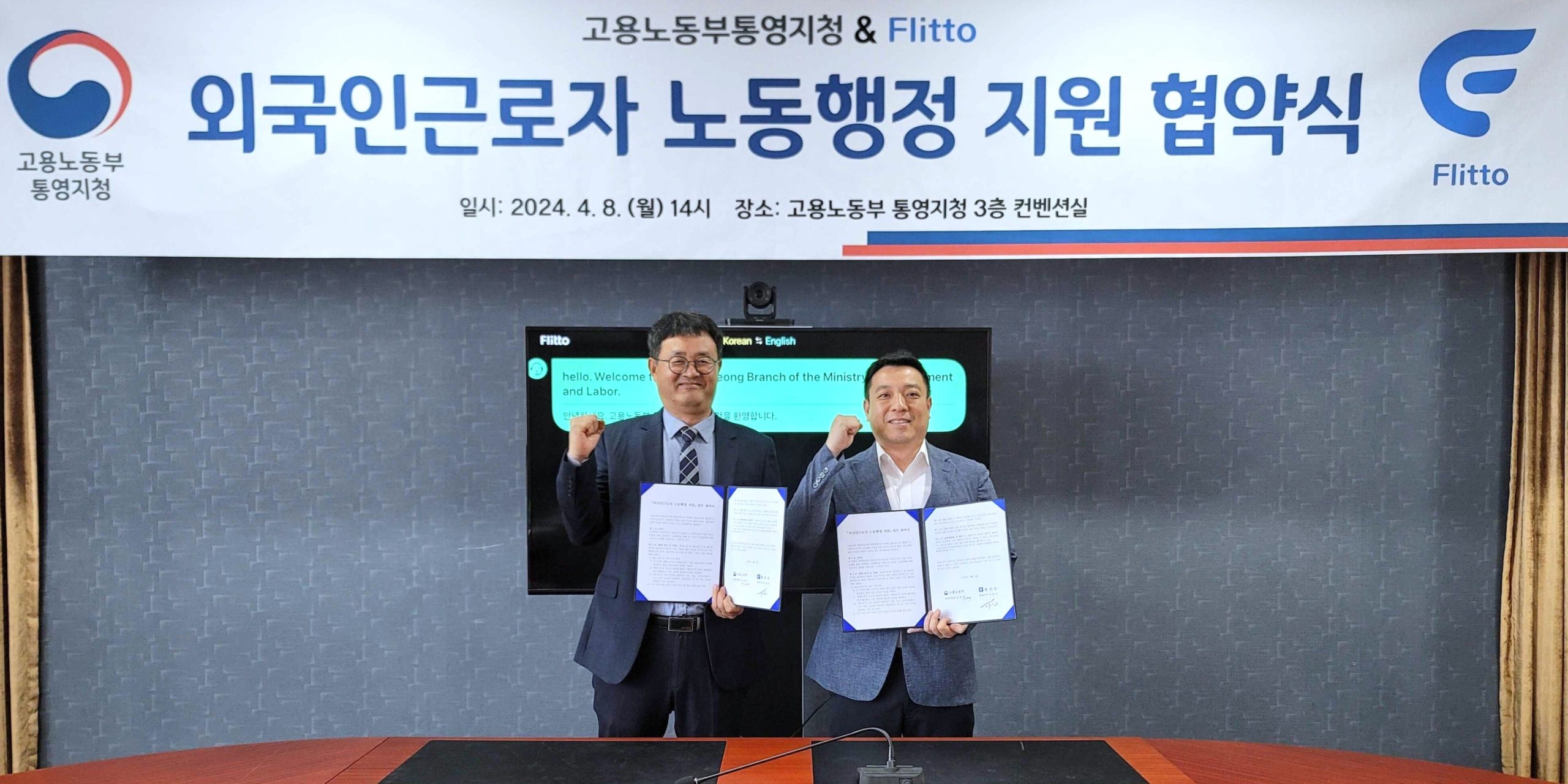 플리토와 고용노동부 통영지청은 외국인 근로자 노동행정 지원 업무협약(MOU)을 체결하고, AI 기술을 활용한 실시간 다국어 통번역 솔루션인 ‘챗 트랜스레이션(Chat Translation·대화 번역)’을 통해 외국인 근로자 행정 서비스를 강화한다.