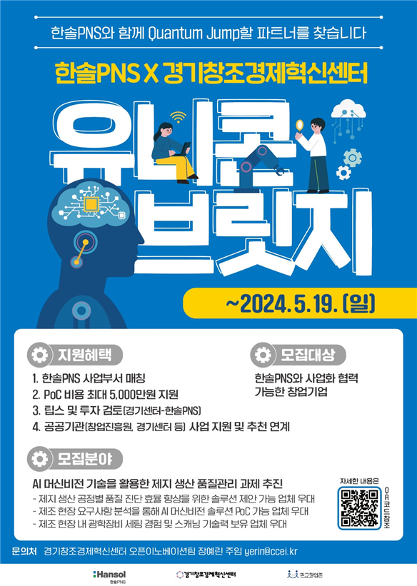 경기창조경제혁신센터(이하 ‘경기혁신센터’)와 한솔피엔에스 주식회사(이하 ‘한솔PNS’)는 ‘2024 한솔PNS X 경기창조경제혁신센터 유니콘 브릿지’에 참여할 기업을 모집한다고 7일 밝혔다.