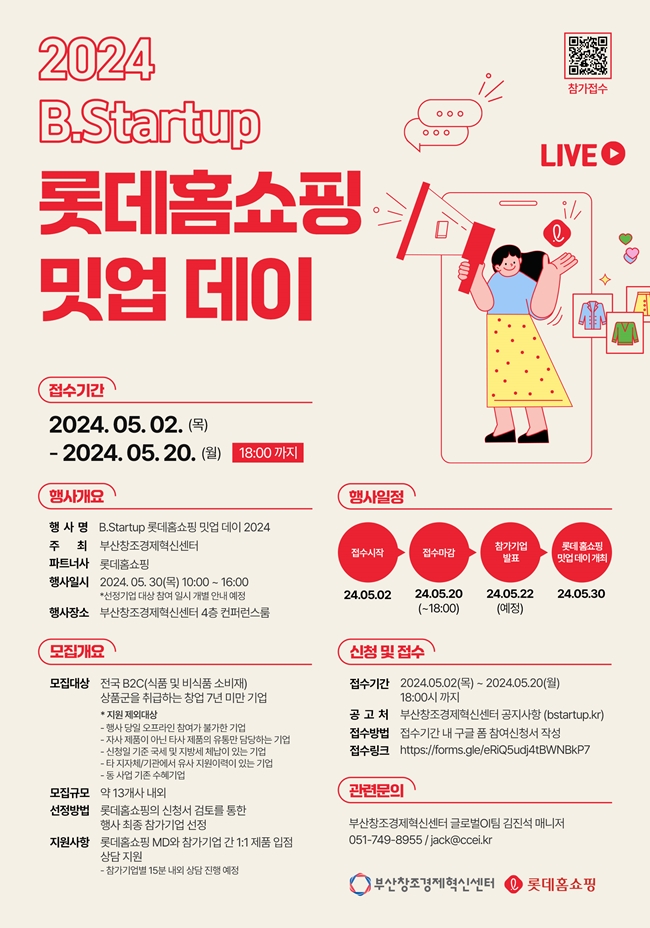 부산창조경제혁신센터(센터장 김용우, 이하 부산창경)는 롯데홈쇼핑과 협업하여 롯데홈쇼핑 입점을 원하는 스타트업에게 1:1 입점 컨설팅을 지원하는 ‘B.Startup 롯데홈쇼핑 밋업 데이 2024’를 오는 30일 부산창경에서 개최한다고 알렸다.