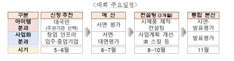 동 대회의 아이템 분과에 참여를 희망하는 국민은 누구나 케이-스타트업(K-Startup) 누리집에 게시된 공고문을 참고하여 신청하면 된다.