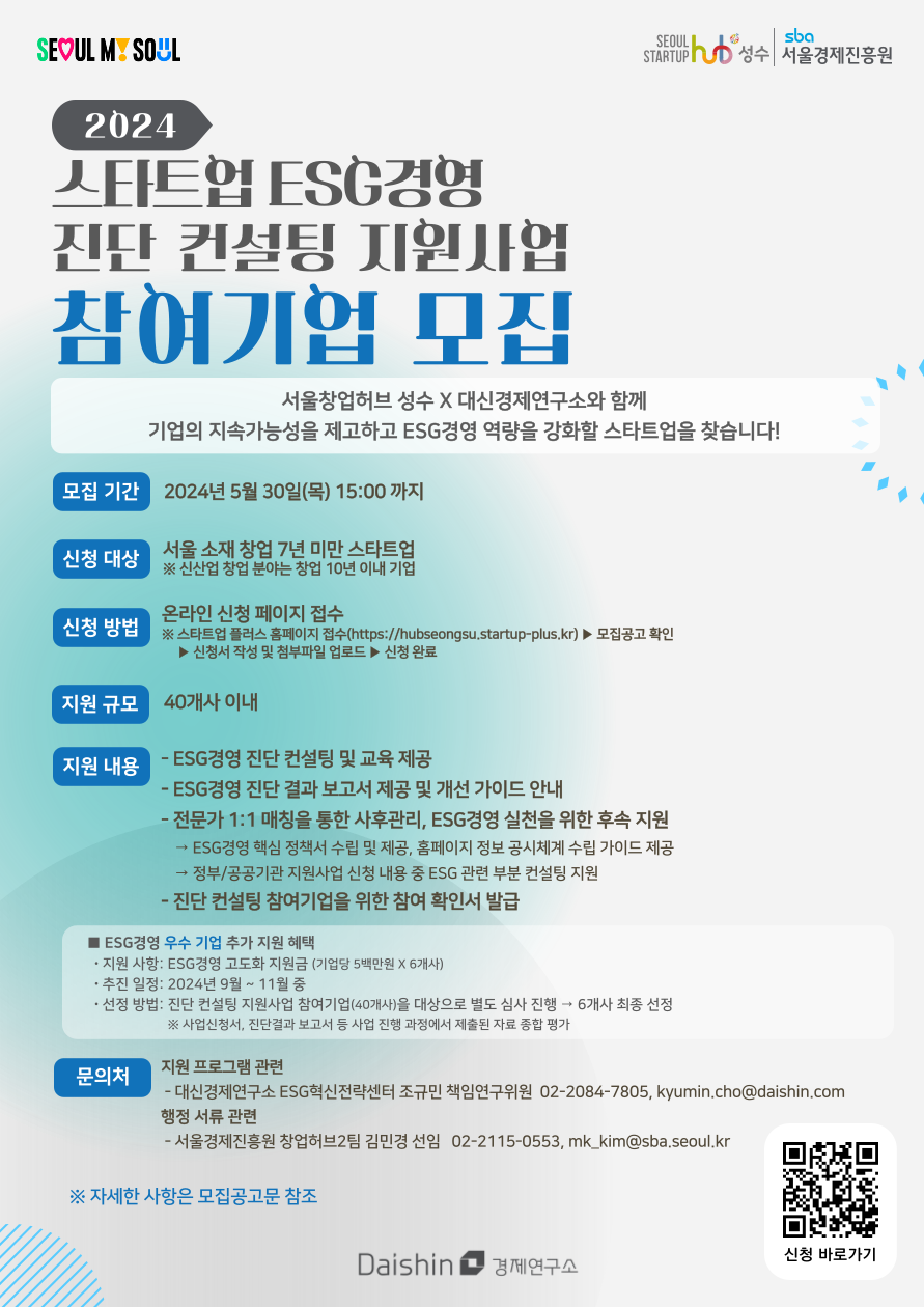 서울경제진흥원(SBA) 서울창업허브 성수는 스타트업 ESG경영 진단 컨설팅 지원사업 참여기업을 모집한다고 밝혔다.