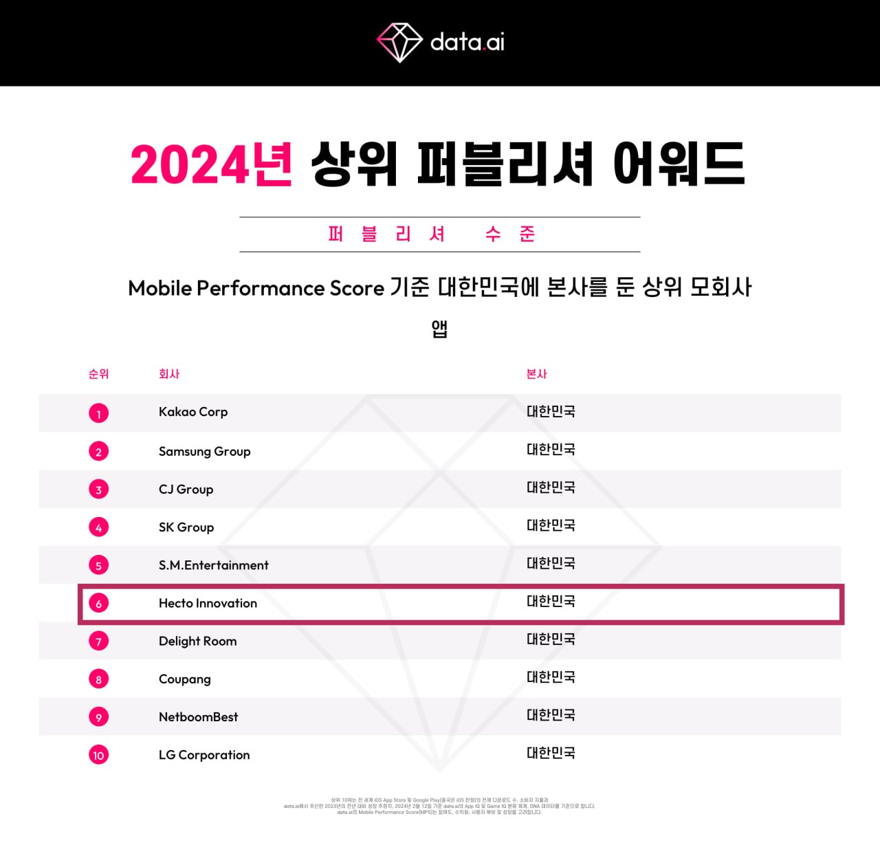 헥토이노베이션은 글로벌 모바일 앱 마켓 분석 사이트 ‘데이터에이아이(data.ai)’가 선정한 ‘2024년 상위 퍼블리셔 어워드’에서 국내 퍼블리셔 6위에 올라 트로피를 받았다.