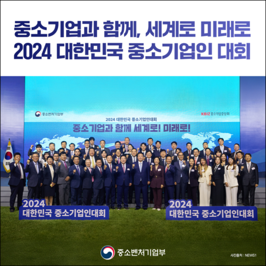 중소벤처기업부(장관 오영주, 이하 중기부)와 중소기업중앙회(회장 김기문, 이하 중기중앙회)는 지난 23일 용산 대통령실 앞 잔디마당에서 “중소기업과 함께 세계로! 미래로!”라는 슬로건으로 ‘2024년 대한민국 중소기업인 대회’를 개최했다고 밝혔다.
