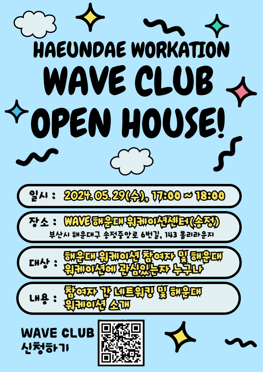이번 5월 WAVE CLUB은 첫 개최로 OPEN HOUSE로 진행되며, 해운대 워케이션 참가자들 뿐 아니라 워케이션에 관심있는 자라면 누구나 참여하여 교류할 수 있는 자리다.