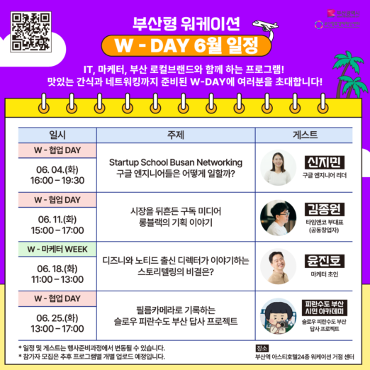 이번 6월 W-DAY는 다음과 같이 운영할 예정이다. ▲(W-협업 DAY) Startup School Busan Networking 구글 엔지니어들은 어떻게 일할까? ▲(W-협업 DAY) 타임앤코 김종원 부대표 : 시장을 뒤흔든 구독 미디어 롱블랙의 기획 이야기 ▲(W-마케터 WEEK) 윤진호 마케터 : 디즈니와 노티드 출신 디렉터가 이야기하는 스토리텔링의 비결은? ▲(W-협업 DAY) 필름카메라로 기록하는 슬로우 피란수도 부산 답사 프로젝트