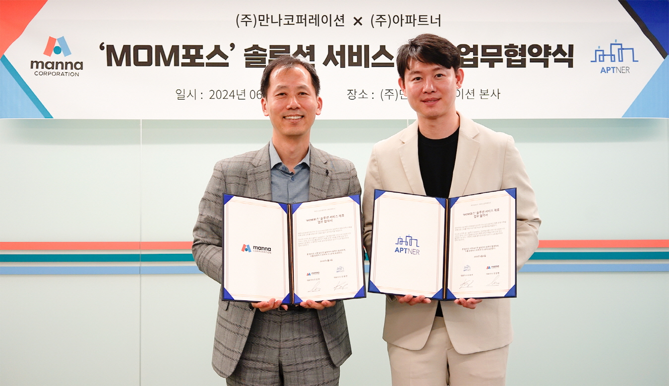 만나코퍼레이션이 지난 4일 아파트 서비스 플랫폼 기업 ‘아파트너’와 MOM포스 솔루션 서비스 제휴 업무협약을 체결했다고 밝혔다.