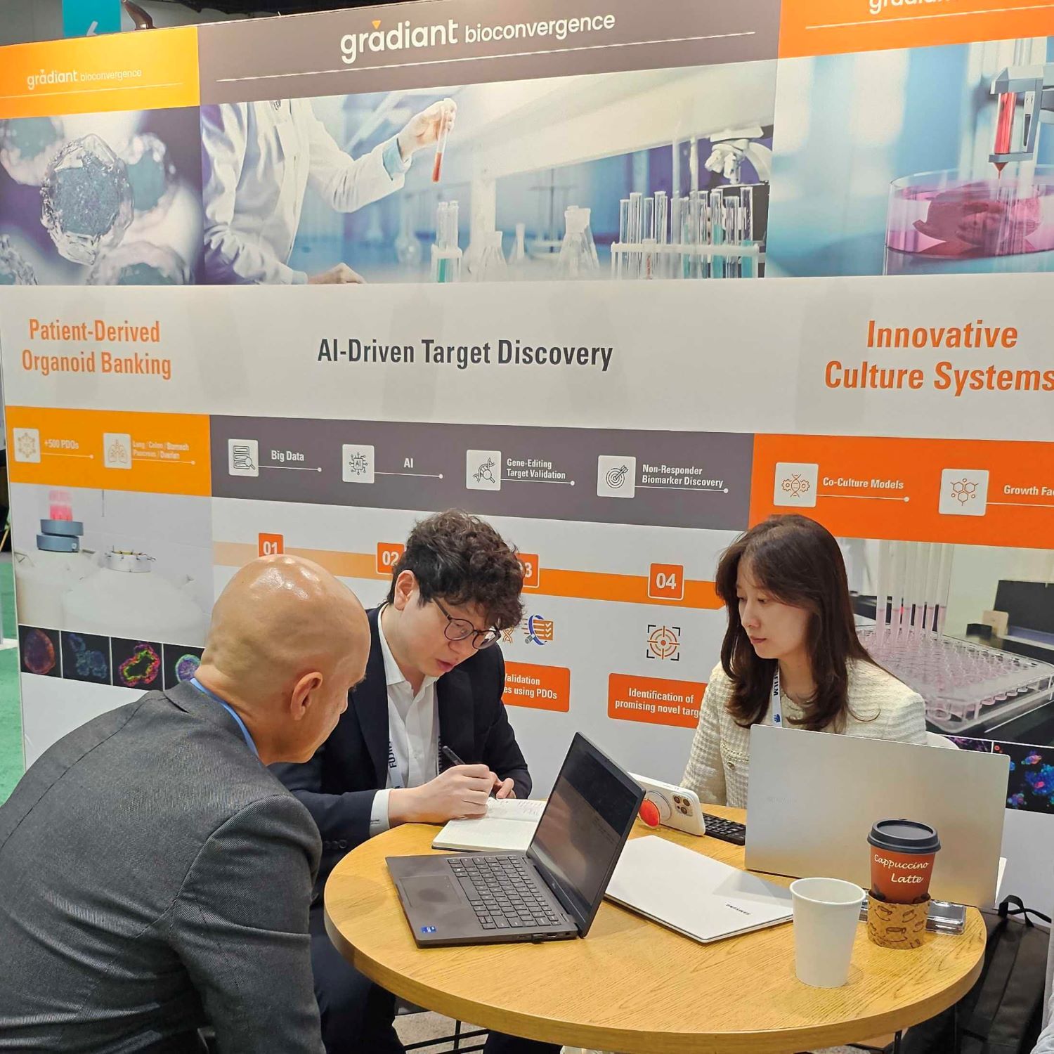 이번 전시회에서 개별 부스를 운영한 그래디언트 바이오컨버전스는 자체 AI 기술을 적용한 암환자 유래 오가노이드(PDO) 기반의 혁신신약 타깃 발굴 플랫폼과 환자 임상정보 및 유전체 정보(NGS)를 포함한 PDO 뱅킹 시스템을 소개했으며, 파트너링을 통해 다수의 글로벌 제약바이오 업체들과 심도 있는 공동 사업화 논의를 진행했다.