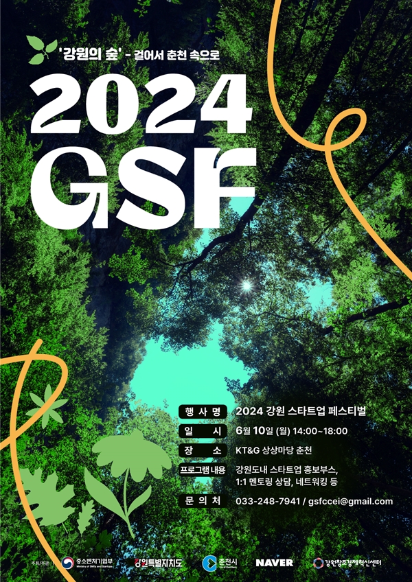 강원창조경제혁신센터(센터장 이해정, 이하 강원혁신센터)가 오는 10일 오후 2시부터 춘천 KT&G 상상마당에서 ‘2024 강원스타트업 페스티벌(GSF)’을 개최한다.