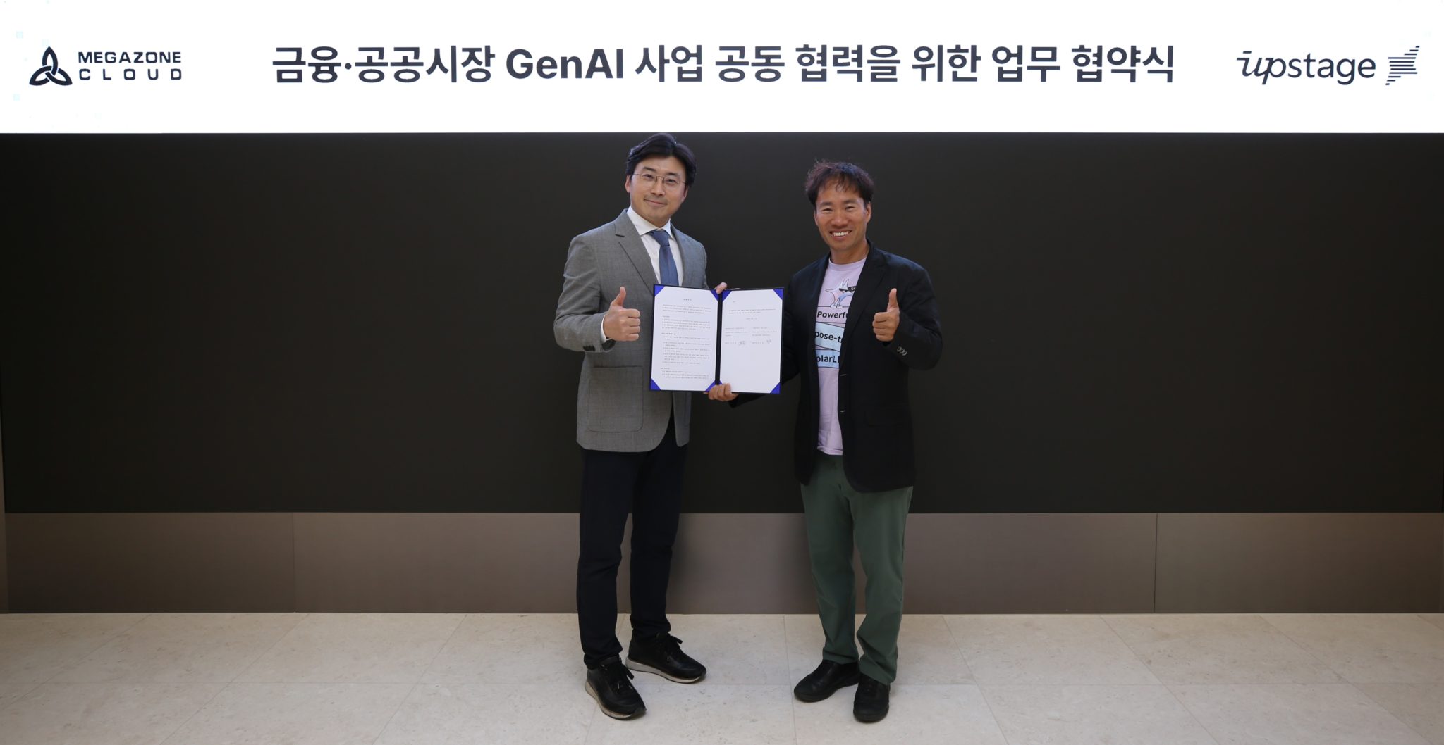 인공지능(AI) 기술 기업 업스테이지는 클라우드 기업 메가존클라우드와 금융 및 공공 부문 생성형 AI 사업 협력을 위한 업무협약(MOU)을 체결했다고 11일 밝혔다. 양사는 이번 업무협약을 통해 금융 및 공공 부문 생성형 AI 사업 수주를 위해 힘을 합치기로 했다. 구체적으로는 업스테이지의 자체 거대언어모델(LLM) ‘솔라’와 메가존클라우드 LLM Ops 솔루션 ‘마틸다(Matilda)’를 통해 고객 환경에 맞는 다양한 LLM 모델을 구축할 계획이다. 또한, 공동 영업과 필요 기술 공유 등 상호 간 협력을 통해 영업 기반을 확대한다. 업스테이지는 솔라를 앞세워 다양한 산업별 특화 모델을 구축하고 있으며, 인텔 코어 Ultra 프로세서에 솔라를 최적화하는 등 유수 글로벌 기업들과 협력 사례를 구체화하고 있다. 향후 한국어, 영어 및 일본어 등 다국어 지원하는 솔라를 기반으로 국내외 영업 기반을 더욱 확대한다는 전략이다. 메가존클라우드 이주완 대표는 “하이브리드·멀티 클라우드 환경에서 서비스 구축 및 운영 경험이 풍부한 아시아 최대 MSP 사업자 메가존클라우드와 세계 최고 수준의 언어모델 솔라를 보유하고 있는 업스테이지의 협업으로 금융·공공부문의 생성형 AI 도입 사업에 높은 시너지가 기대된다”고 말했다. 업스테이지 김성훈 대표는 “메가존클라우드와 파트너십을 통해 금융 및 공공기관에 최적화된 생성형 AI 솔루션 공급을 확대하게 되어 기쁘다”라며 “앞으로 업스테이지는 세계 최고 수준의 자체 언어모델 솔라를 기반으로 다양한 산업 및 기업 맞춤형 생성형 AI 혁신을 이끌어 나갈 것”이라고 밝혔다. 관련 기사 더보기 https://www.venturesquare.net/927488