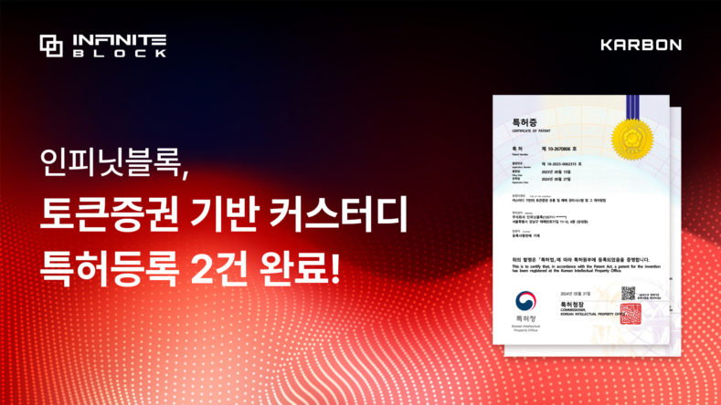 인피닛블록(대표이사 정구태)이 커스터디 기반 토큰증권 발행, 유통을 위한 특허등록 2건을 완료하였다고 18일 밝혔다.