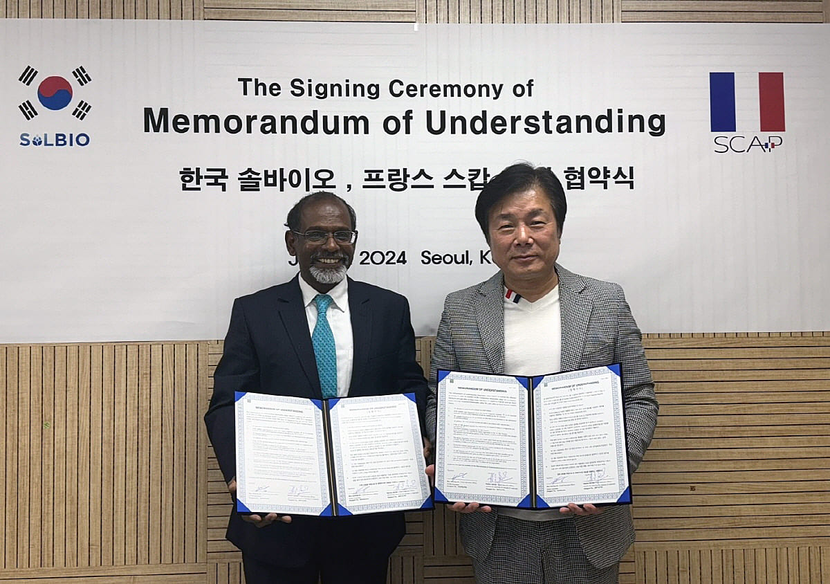 엑소좀 전문기업 ‘솔바이오’는 솔바이오 본사에서 반경식 솔바이오 대표와 헤스론 제이콥(Hezron Jacob) SCAP 대표가 참석한 가운데, 한국-프랑스 합작사 ‘스캅 코리아'(SCAP KOREA)를 설립하기 위한 협약식을 가졌다고 18일 발표했다.