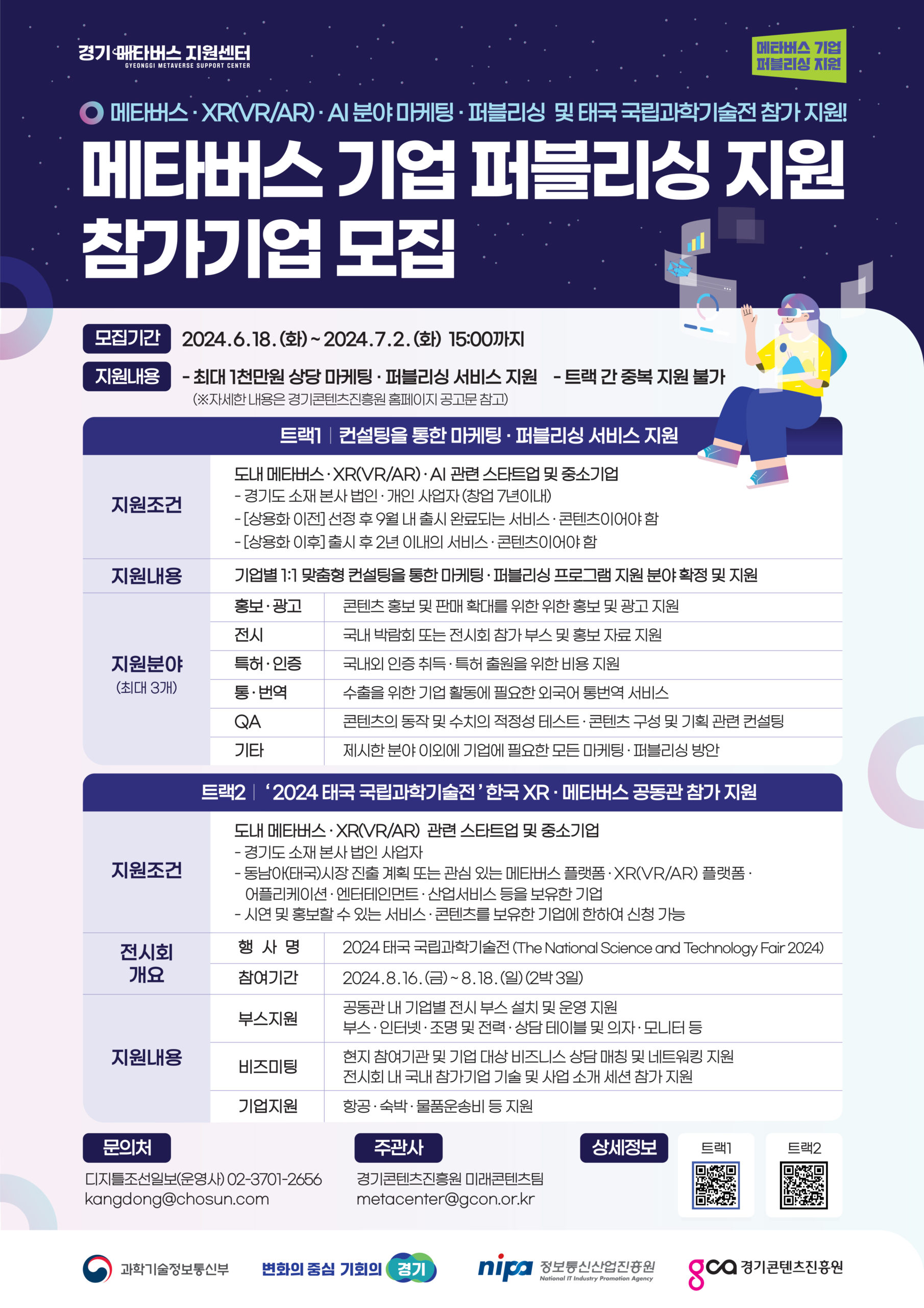 과학기술정보통신부와 경기도, 정보통신산업진흥원이 지원하는 이번 ‘메타버스 기업 퍼블리싱 지원’ 사업은 ▲‘맞춤형 컨설팅을 통한 마케팅·퍼블리싱 지원’ ▲‘2024 태국 국립과학기술전 한국 XR/메타버스 공동관 참가 지원’ 등 2개 분야 총 8개 사를 지원한다.