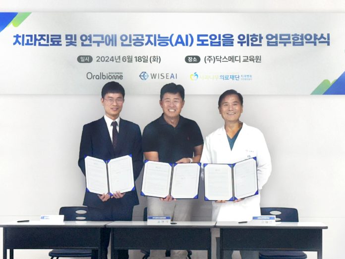 인공지능(AI) 플랫폼 개발 전문기업 와이즈에이아이가 의료법인 ‘사과나무의료재단’, 구강 마이크로바이옴 전문기업 ‘닥스메디오랄바이옴(이하 닥스메디)’과 전략적 파트너십 구축을 위한 3자간 업무협약(MOU)을 체결했다고 19일 밝혔다.