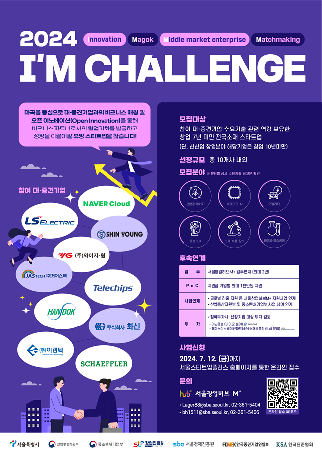 2024년 아임챌린지(I’M Challenge)에는 대·중견기업 10개사가 참여, 친환경·에너지, 빅데이터·AI 등 서울의 미래산업 6개 기술을 보유한 유망 스타트업을 발굴할 예정이다.