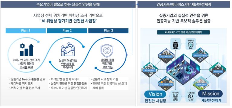 ㈜버넥트가 충북과학기술혁신원에서 주관하는 '2024년 충청북도 AI, 메타버스 기반 산업 재난 안전 관리체계 강화' 과제에 선정됐다고 밝혔다. 이번 ‘충청북도 AI, 메타버스 기반 산업 재난 안전 관리체계 강화’ 과제는 산업현장에서 3D 메타버스 기반의 통합 실시간 데이터를 모니터링 하고, AI기술을 활용하여 추론하며, 디지털 트윈 등 XR기술을 이용하여 시각화를 구현한다. 이를 통해 재난안전관련 감시 효율성과 대응력을 증대시키는 3D AI·메타버스 모니터링 시스템을 구축하는 사업으로 2025년 말까지 2년 동안 진행되는 과제다. 이번 과제의 주관기업은 에이치에스소프트㈜(대표이사 박명석)로 산업안전의 핵심인 AI안전 관제 기반 위험성 평가 관리모델 개발 및 IoT 데이터 연동을 담당하며, 3D 메타버스 기반 통합 산업재난안전관리 모니터링 체계 플랫폼 구축에 ㈜버넥트, 인프라 구축 및 Legacy시스템 연계를 담당하는 ㈜휴먼시스템, 분야별 연계 총괄 및 IoT연동을 위한 PLC 개조를 담당하는 LS ELECTRIC㈜이 참여기관으로 과제를 수행한다. 이번 과제의 참여기관으로 선정된 버넥트는 산업현장에서 AI머신러닝 기반 컴퓨터비젼(Computer Vision) 기술을 통하여 AI기술이 접목된 XR솔루션을 제공하는 DX(디지털전환) 이다. 버넥트 관계자는 “첨단기술인 XR솔루션을 활용하여 재난이나 사고상황에 대한 재난안전 3D AI·메타버스 플랫폼 개발에 참여하게 되었다”며, “버넥트의 XR솔루션을 통하여 산업현장의 위험상황을 모니터링 하고 제어할 수 있는 모니터링 체계 플랫폼을 구축해 나갈 것”이라고 하며, “XR기술인 영상 관제에 AI를 접목하여 위험성 평가와 위험개선 기능을 관리할 수 있는 프로세스도 함께 정립할 예정”이라고 말했다. 충북과학기술혁신원 관계자는 “글로벌 수준의 XR기술과 AI기술 등 첨단기술을 가진 회사들이 함께 모여, 재난안전 관리체계 강화를 위하여 과제를 수행한다”며, “산업현장에서 XR솔루션, AI 등 첨단기술의 접목을 통하여 충북과학기술혁신원과 참여기관들이 함께 충북지역의 산업안전과 생산효율성을 높여 글로벌 진출을 위한 솔루션들을 구축해 나가겠다”라고 말했다. 관련 기사 더보기 https://www.venturesquare.net/929936