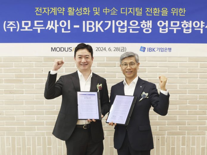 (주)모두싸인(대표 이영준)IBK기업은행(은행장 김성태)과 중소기업의 전자계약을 지원하고 디지털 전환을 촉진하기 위해 협업한다.