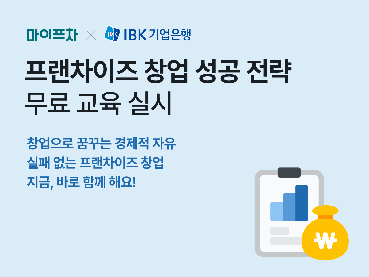 프랜차이즈 창업 플랫폼 마이프차가 오는 7월 22일 수원상공회의소에서 예비 창업자를 위해 ‘검색해도 나오지 않는 프랜차이즈 창업 성공전략’ 무료 교육 프로그램을 실시한다고 밝혔다.