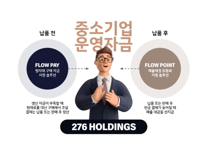 276홀딩스는 중소기업과 소상공인들의 운영자금 조달 솔루션을 온라인 플랫폼에서 제공한다. 생산 자금이 부족한 중소기업에게 대신 원재료를 구매해서 납품해주고 나중에 결제를 받는 플로우페이 서비스와, 매출채권을 유동화해주는 플로우포인트 서비스가 대표적이다.
