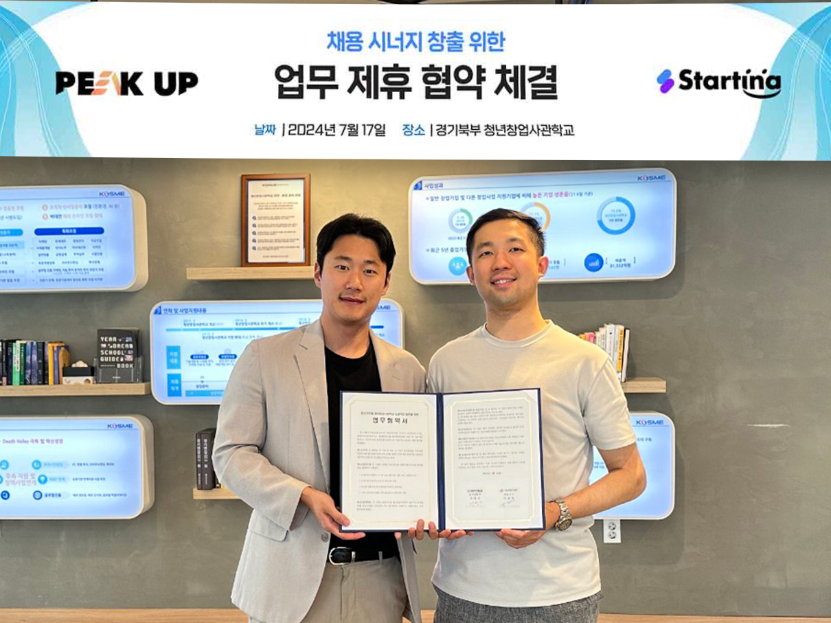 피크업과 스타팅 운영사 모밋이 상호 협력 양해각서(MOU)를 체결했다고 밝혔다. 이번 MOU 체결은 경기북부 청년창업사관학교 회장 이정우 대표가 운영하는 피크업과 부회장 김홍찬 대표가 운영하는 모밋 간의 전략적 파트너십을 통해 기업 및 인재풀 교류, 채용 범위 확대 등 다양한 시너지 효과를 창출하기 위한 것이다.